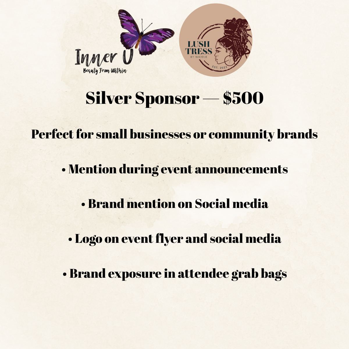 Perfect for small businesses or community brands • Logo on event flyer and social media • Brand mention on Social media • Brand exposure in attendee grab bags • Mention during event